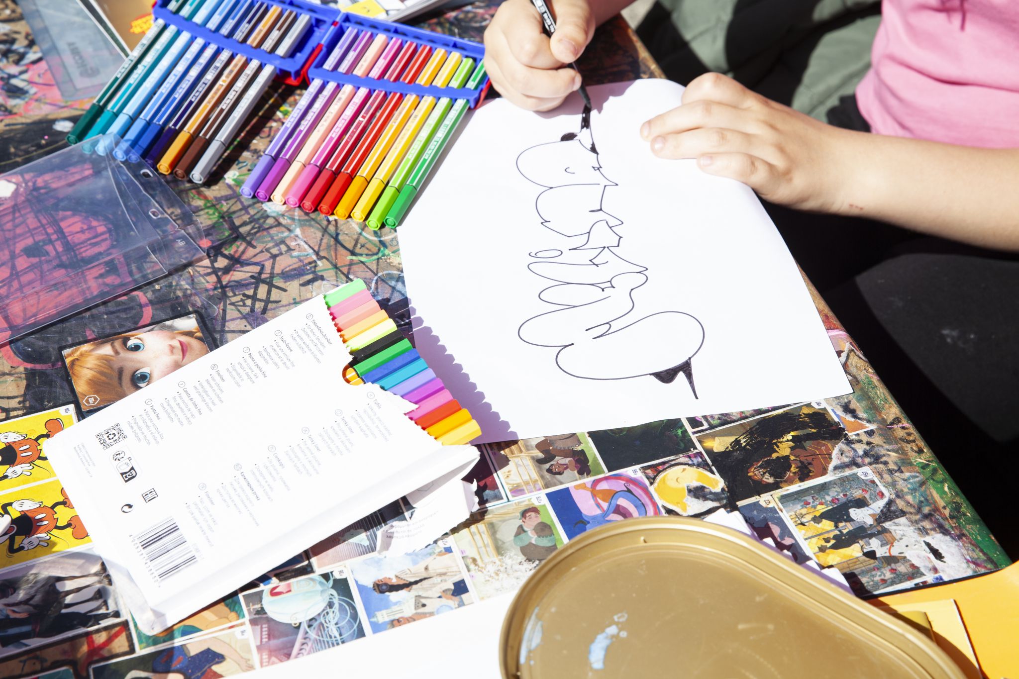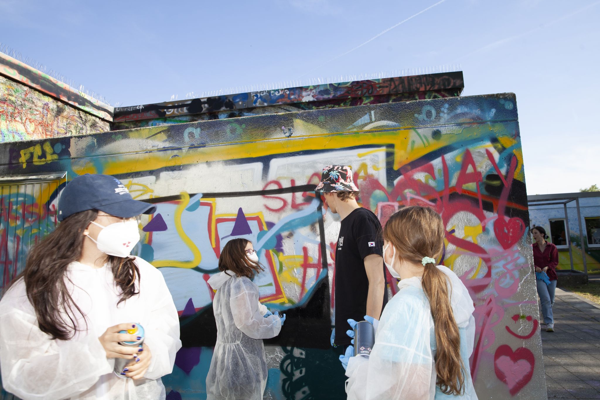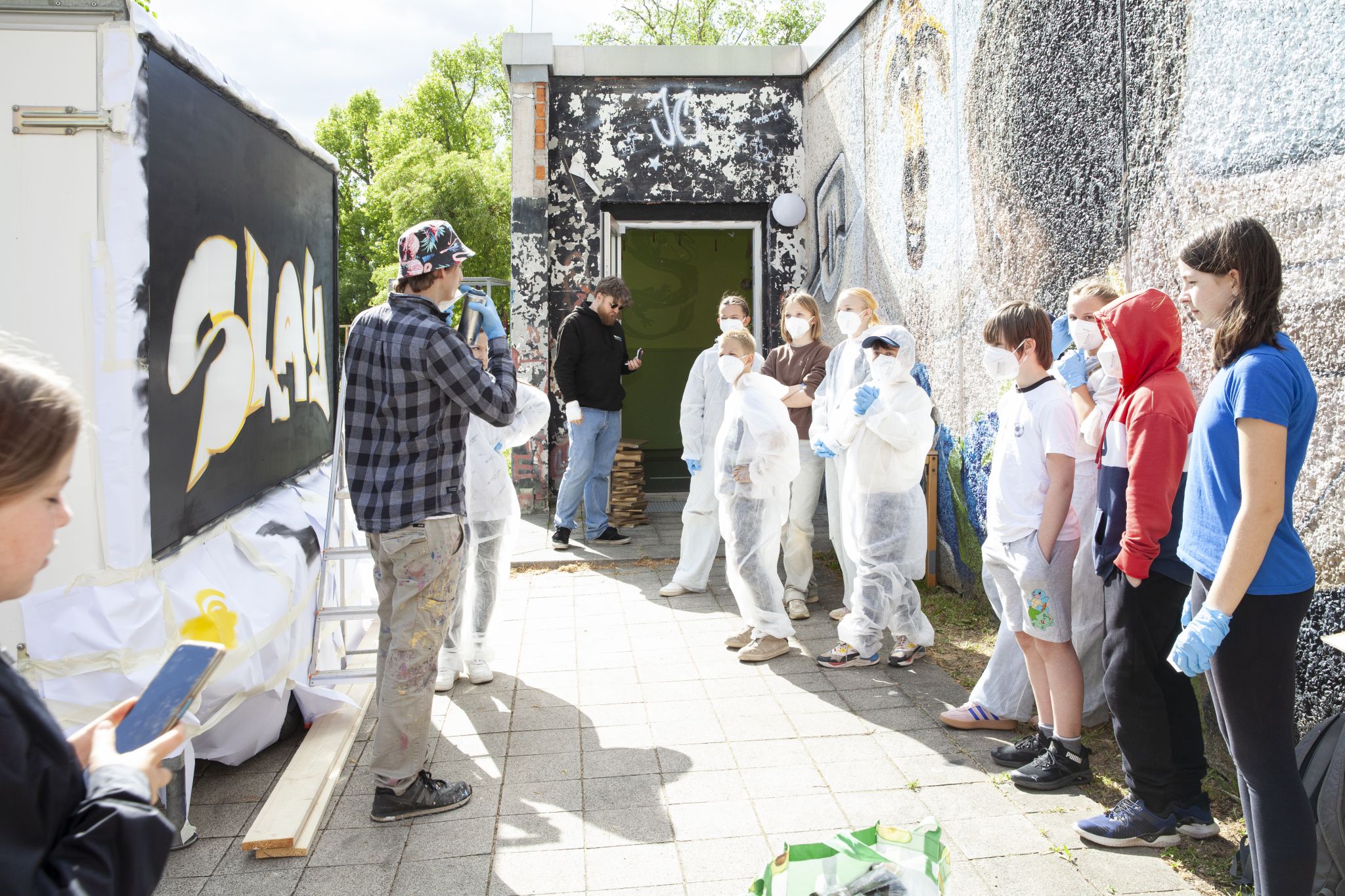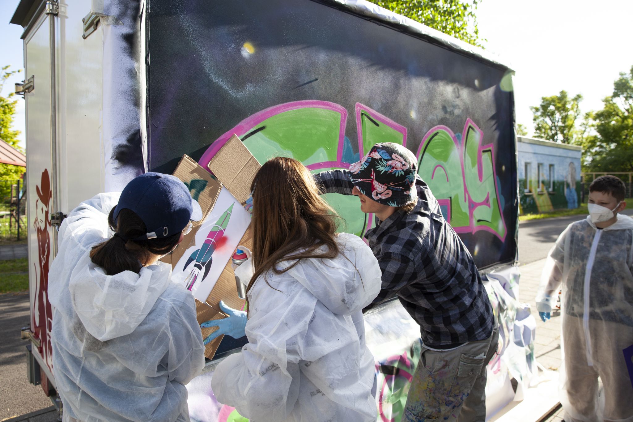 Um den Anhänger zu verschönern gab es dafür extra einen Graffiti Wokshop, der im Mai 2025 durchgeführt wurde. Jakob Nickels hat den Workshop geleitet und zusammen mit den Kindern und Jugendlichen Skizzen gemacht, das Sprühen geübt und schließlich den Anhänger nach ihren eigenen Vorstellungen gestaltet.