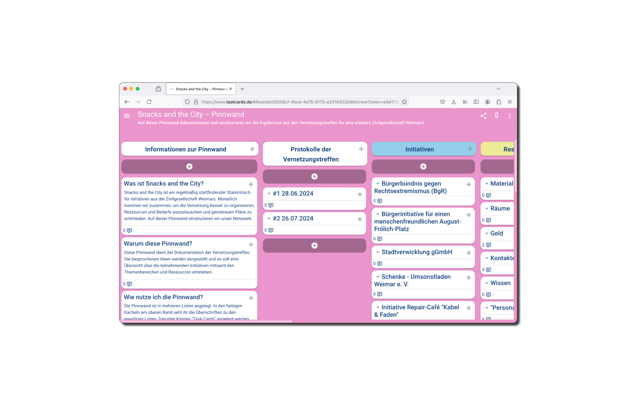Letzten Monat haben wir den gelungenen gelungenen Auftakt von Snacks an the City gefeiert und möchten nun daran anknüpfen. Zusammen haben wir viele Gedanken für eine bessere Zusammenarbeit der organisierten Zivilgesellschaft gesammelt. Schnell waren wir uns einig: in Weimar gibt es viele Initiativen und tolle Projekte, doch es fehlt eine Kenntnis davon, was alles so passiert. Daher haben wir jetzt eine Plattform geschaffen, um Initiativen vorzustellen, Ressourcen anzuzeigen oder einfach eine Veranstaltung zu teilen. Neugierig geworden? Dann schau doch mal auf unserer Digitalen Pinnwand vorbei! Das Passwort lautet: SATC2024!
